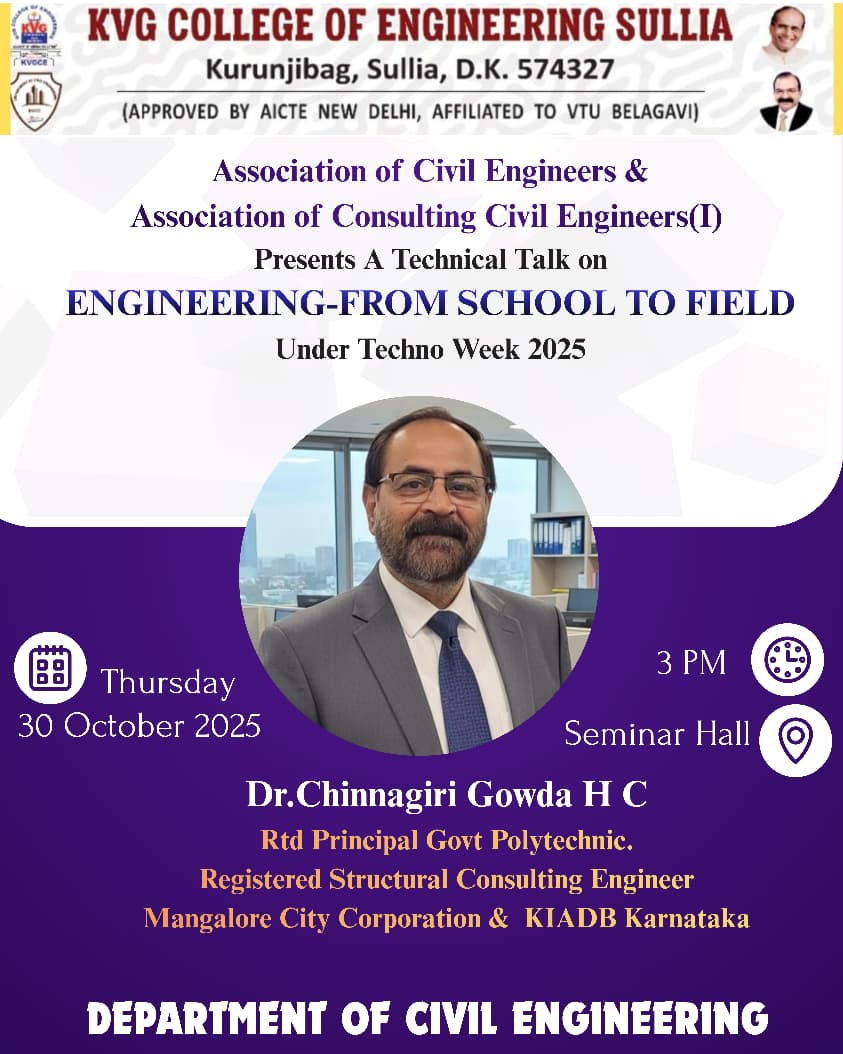 ACE & ACCE(I) presents a technical talk on “Engineering from school to field “ under techno week 2025 by Dr Chinnagiri Gowda H C, Retired Principal government polytechnic, Registered structural consulting Engineer Mangalore city co-operation & KIADB Karnataka on 30 october 2025