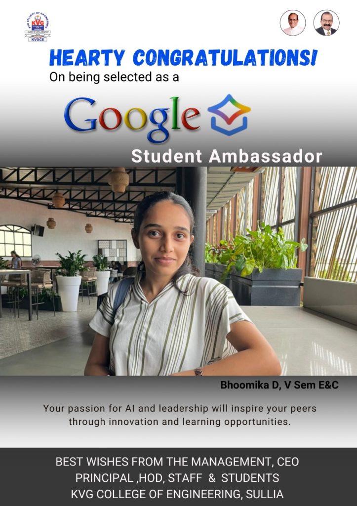 Bhoomika D, a 5th-semester Electronics & Communication (E&C) student, has been selected as the Google Student Ambassador for the year 2025-26. This prestigious recognition highlights her leadership skills, technical knowledge, and active involvement in technology and community initiatives. As a Google Student Ambassador, Bhoomika will have the opportunity to engage with the latest Google technologies, organize workshops, and represent her college in various events and programs conducted by Google. The faculty and students congratulate her on this remarkable achievement and wish her continued success in her endeavors.