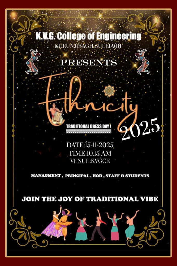Traditional Dress Day was celebrated with great enthusiasm and cultural pride on 15/11/2025 at KVG College of Engineering, Sullia. The event aimed to promote India’s rich cultural heritage and encourage students to appreciate and preserve traditional values through attire.