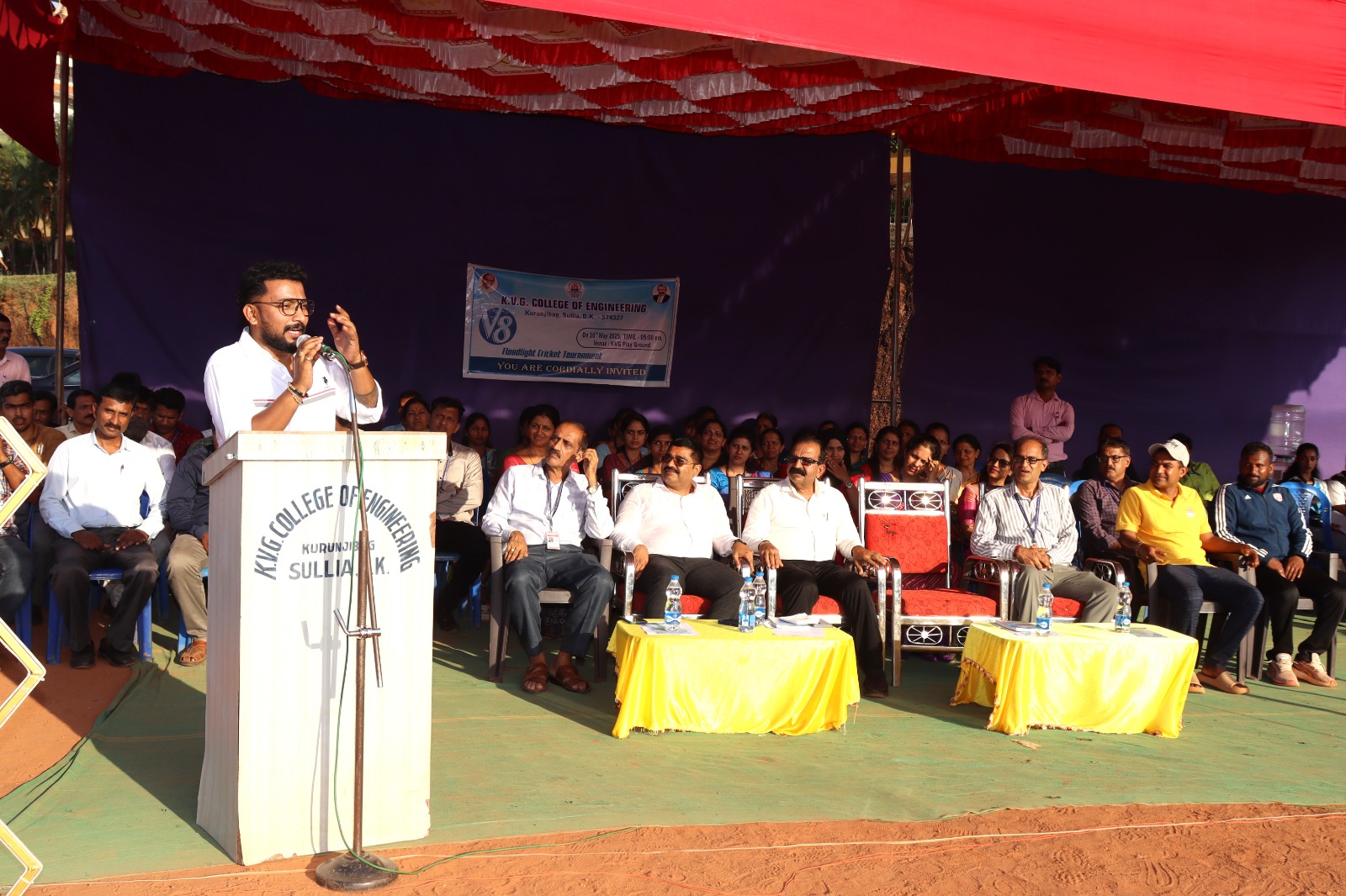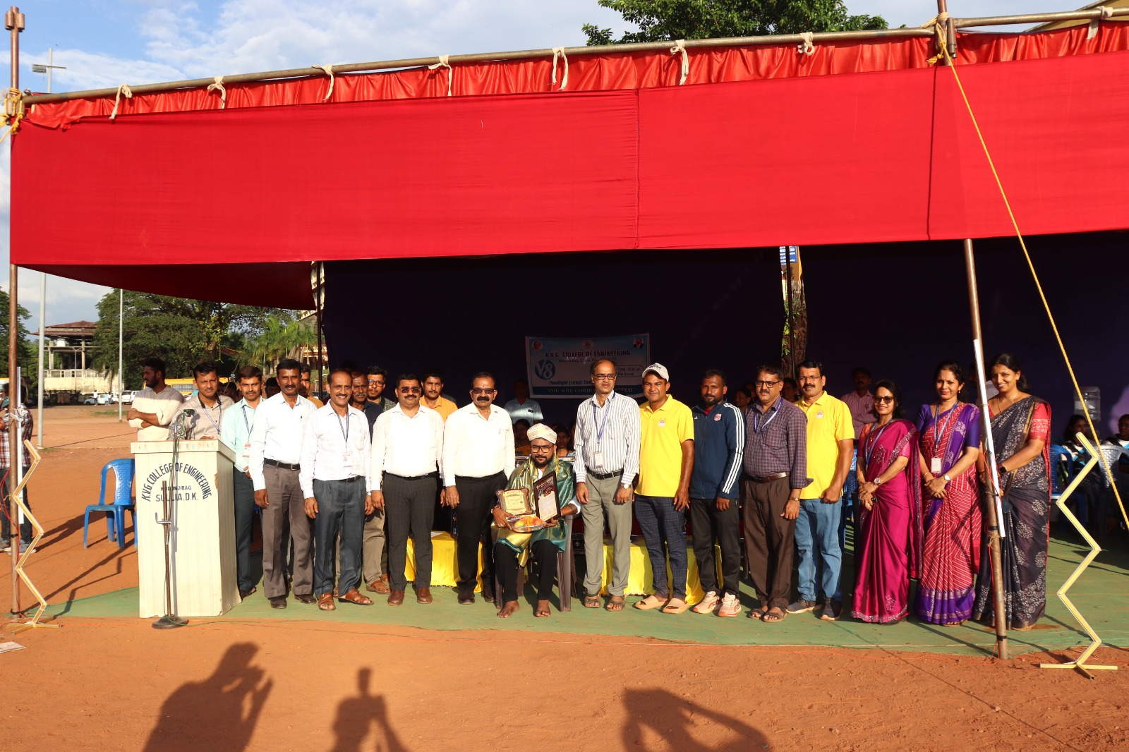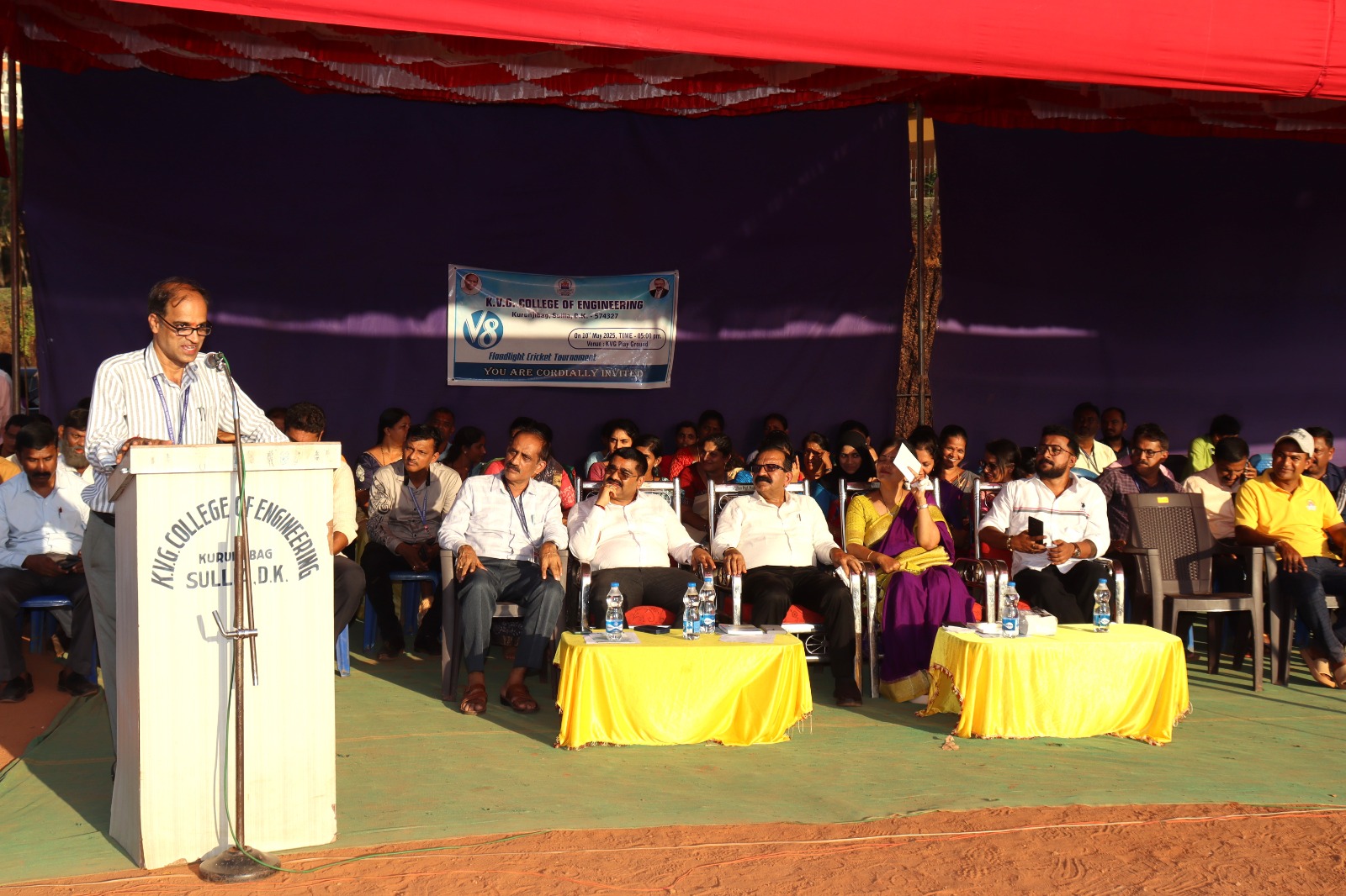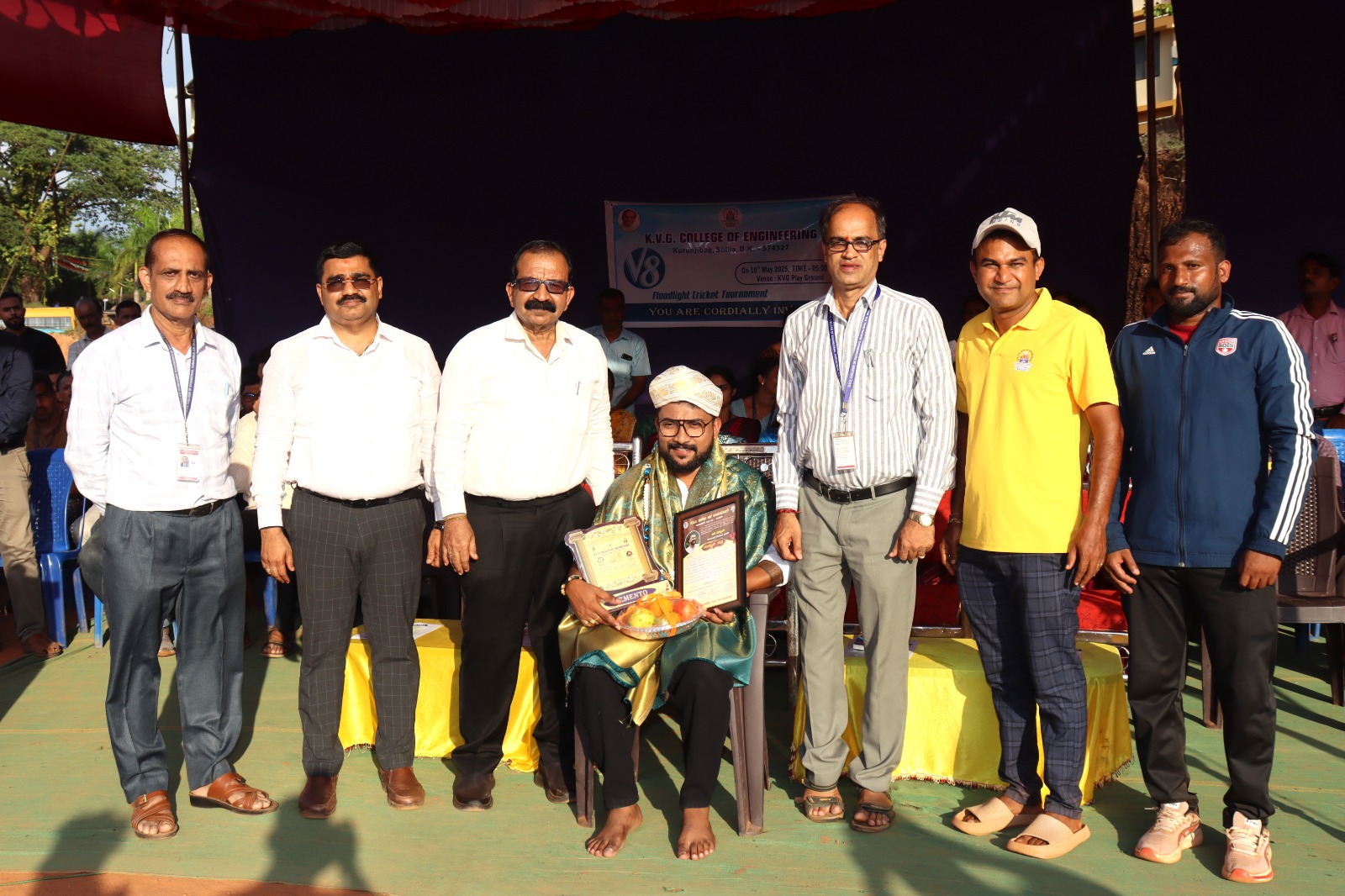 • The V8 Flood Light Cricket Tournament was conducted on 10th May 2024 at KVG Playground. It was inaugurated by Mr. Vinup Mallara, Director, TAPCMS, and Kollamogaru, Harihara Society. A total of 26 teams participated, with the V8 winners being the Department of CS&E – AI&ML team, and the Runners-up being the Department of Mechanical Engineering Team.
