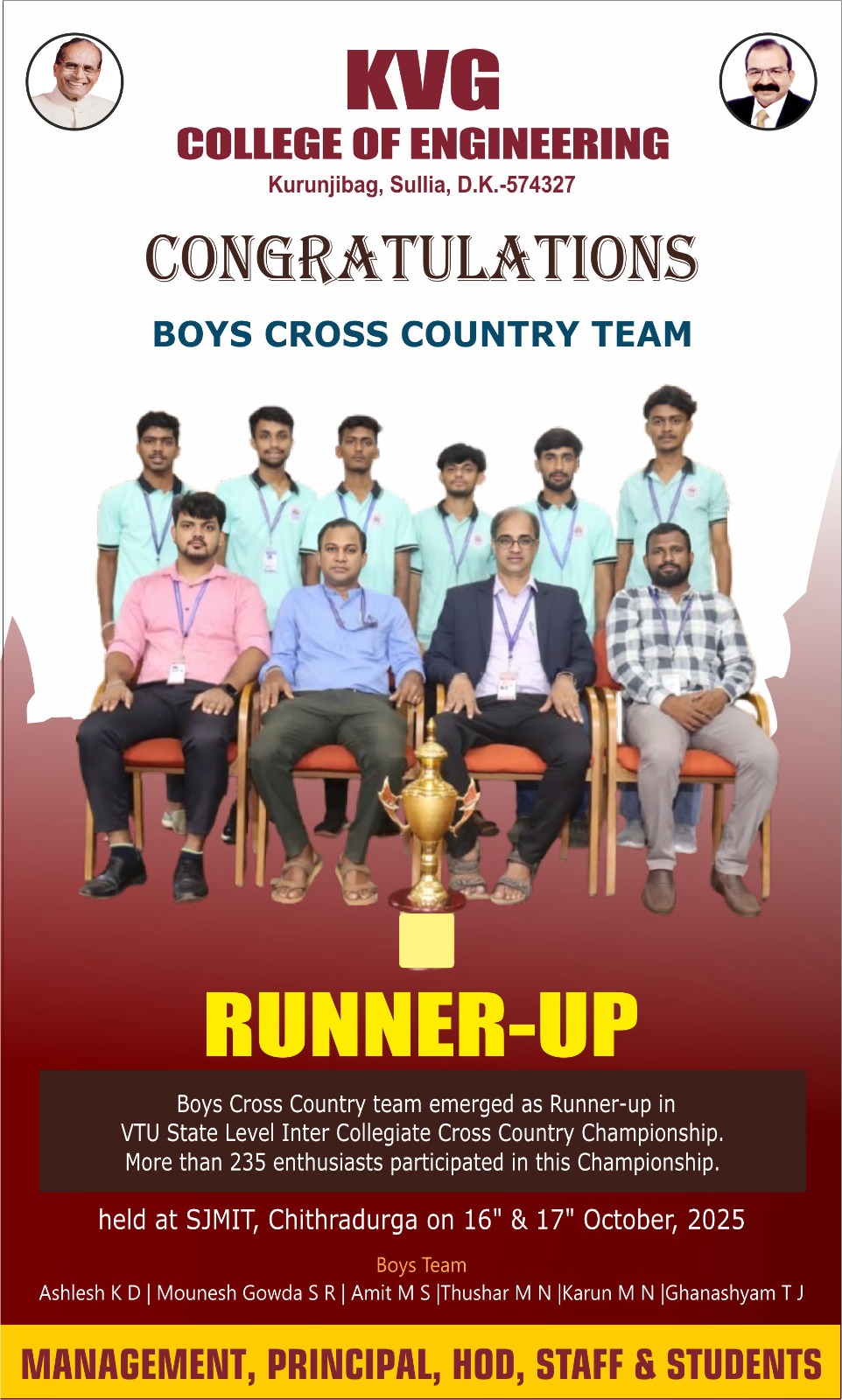 • Our college team participated in the VTU State Level Men’s Cross Country Championship held on 16th and 17th October 2025 at SJMIT, Chitradurga and secured the overall Runners-up position.